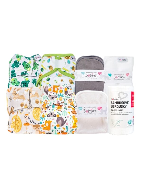 Akční kombinovaná sada plenek All in One (vše v jednom) a svrchních kalhotek Bobánek je další variantou, jak se dají naše plenky a svrchní kalhotky kombinovat. Sada obsahuje pleny All in One, ale i svrchní kalhotky, do kterých vkládáte naše bambusové, fleecové vkládací pleny a extra savý prefold.