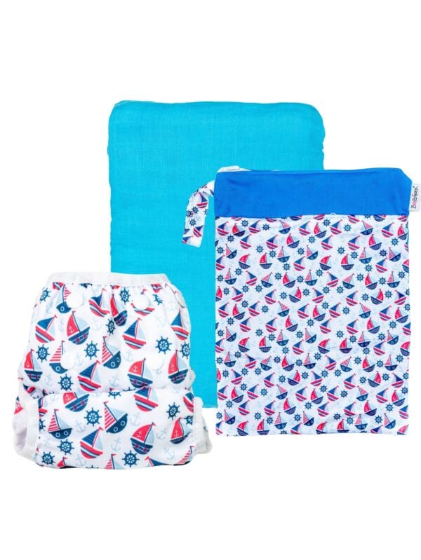 Letní set k vodě obsahuje 1x Bambusovou zavinovací plenu Duo Pack, 2x Rostoucí plavky a 1x Nepromokavou tašku normal
